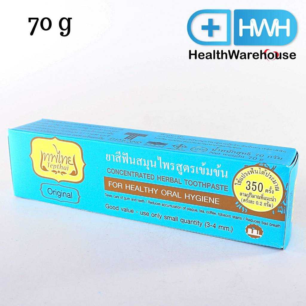 ยาสีฟัน เทพไทย รสดั้งเดิม ผลิตจากสมุนไพรธรรมชาติ พิมเสน การบูร ข่อย กานพลู และสะระแหน่ มีคุณสมบัติในการดูแลปัญหาสุขภาพเหงือก ฟันผุ และลดคราบหินปูน ชา กาแฟ ลดกลิ่นปาก ทำให้ปากสะอาด ลมหายใจสดชื่น