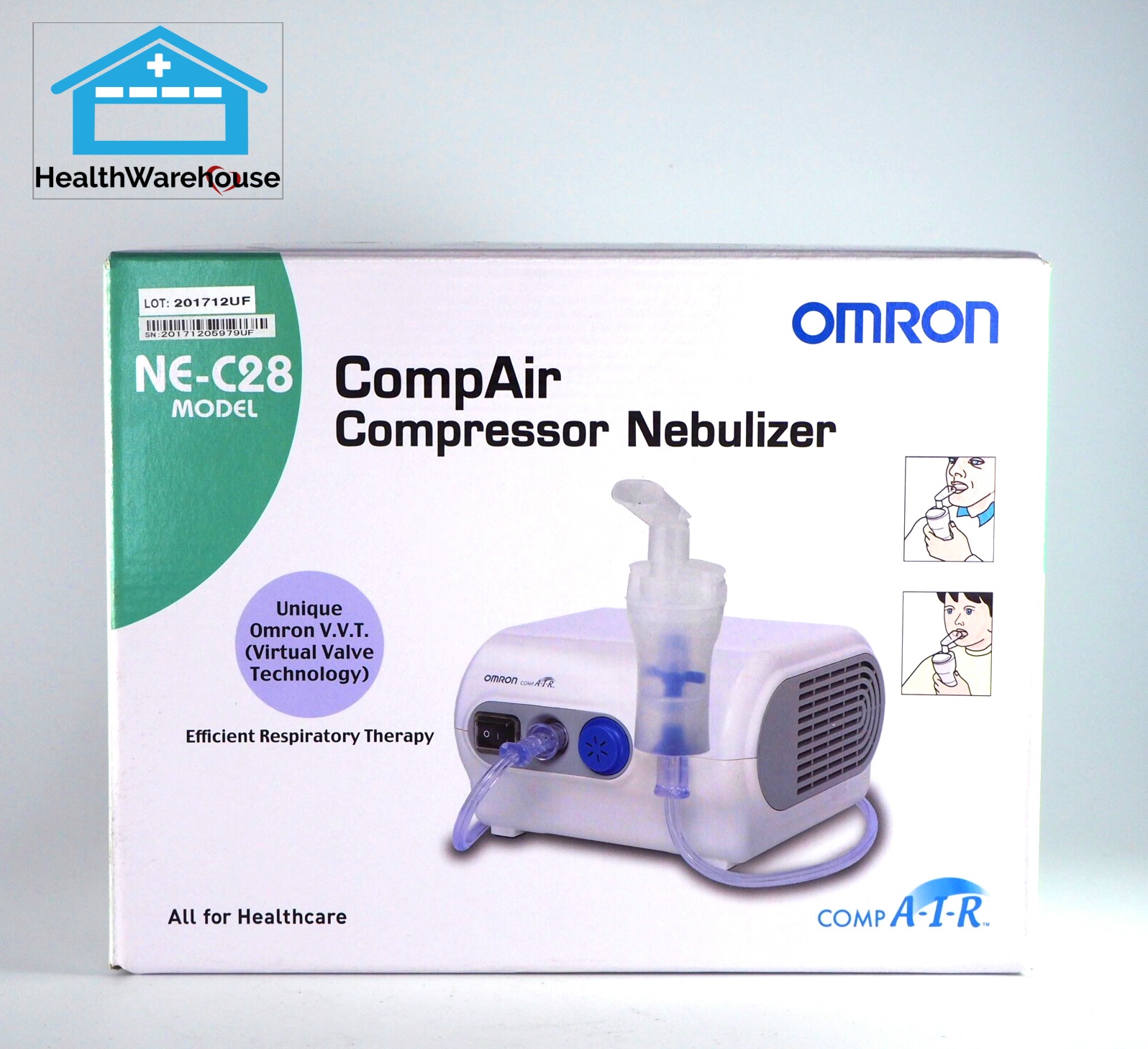 คุณสมบัติเป็นเครื่องพ่นยาแบบ Air Compressor ใช้วาล์วแบบใหม่ VVT (Vitural Valve Technology)ซึ่งคิดค้นโดย Omron ซึ่งทำให้ผู้ใช้สามารถหายใจออกผ่านปากเป่าได้ การไม่ใช้ซิลิคอนวาล์วมีข้อดีคือการทำความสะอาดได้ง่าย และไม่ต้องกังวลว่าชิ้นส่วนวาล์วจะหลุดเข้าในคอข้อมูลจำเพาะ– อัตราการพ่นยา 0.4 ml/min (ไม่มี Cap)– ขนาดละอองยา 5 ไมครอน– ความจุยา 2-7 ml.– แหล่งพลังงาน 230 Volt 50 Hz พลังงานที่ใช้ 138 W– ขนาดเครื่อง 17.0×18.2×10.3 cm.– น้ำหนัก 1.9 kg. (เฉพาะตั้วเครื่อง)– รับประกัน 1 ปี โดยศูนย์ Omron– ดาวน์โหลด คู่มือการใช้งาน NE-C28คุณสมบัติ เป็นเครื่องพ่นยาแบบ Air Compressor ใช้วาล์วแบบใหม่ VVT (Vitural Valve Technology) ซึ่งคิดค้นโดย Omron ซึ่งทำให้ผู้ใช้สามารถหายใจออกผ่านปากเป่าได้ การไม่ใช้ซิลิคอนวาล์ว มีข้อดีคือการทำความสะอาดได้ง่าย และไม่ต้องกังวลว่าชิ้นส่วนวาล์วจะหลุดเข้าในคอข้อมูลจำเพาะ – อัตราการพ่นยา 0.4 ml/min (ไม่มี Cap) – ขนาดละอองยา 5 ไมครอน – ความจุยา 2-7 ml. – แหล่งพลังงาน 230 Volt 50 Hz พลังงานที่ใช้ 138 W – ขนาดเครื่อง 17.0×18.2×10.3 cm. – น้ำหนัก 1.9 kg. (เฉพาะตั้วเครื่อง) – รับประกัน 1 ปี โดยศูนย์ Omron – ดาวน์โหลด คู่มือการใช้งาน NE-C28