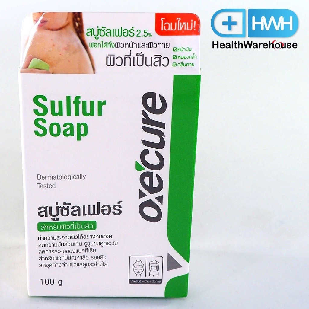 Oxe cure sulfur soap อ๊อกซีเคียว ซัลเฟอร์โซป ลดสิวผิวหน้ามัน ภูมิแพ้ผิวเหมาะกับคนที่มีปัญหาเรื่องผิวพรรณ เพราะสารซัลเฟอร์มีสรรพคุณในการทำให้ผิวที่หยาบกร้าว หรือผิวเสียหลุดลอกออกเป็นขี้ไคลง่ายขึ้นเพื่อผิวใหม่ที่สดใสมาแทนที่เหมือนเอาตัวไปแช่น้ำแร่ ประโยชน์หลักจากสารประกอบในสบู่คือ – Mild Antiseptic ฆ่าเชื้ออ่อนๆทำให้ผิวที่เป็นแผลถลอกจะหายได้อย่างรวดเร็วขึ้น – Mild Antifungal มีสรรพคุณฆ่าเชื้อราอ่อนๆดังนั้นผิวส่วนใดที่ติดเชื้อราหรือโรคที่เกิดจากเชื้อราอื่นๆ เช่น กลากเกลื้อน ก็จะหายเร็วขึ้นด้วย – Mild Antibacteria ช่วยฆ่าเชื้อแบคทีเรียอันเป็นสาเหตุของการเกิดสิวที่ใบหน้าและแผ่นหลังหรือหน้าอกและการเกิดกลิ่นตัว จุดอับต่างๆและเท้าเหม็นอับชื้น ก็สามารถขจัดออกไปได้ – สบู่นี้มีโปรตีนจากถั่วเหลืองเป็นมอยเจอร์ไรเซอร์ ช่วยให้ความชุ่มชื้นกับผิวหนังผิวจะไม่แห้งตึงหลังใช้และไม่หยาบกร้านเมื่อใช้ต่อเนื่องจะทำให้ผิวดูอ่อนกว่าวัย ยังช่วยลดการอักเสบของผิวหนัง เช่นผิวที่แพ้ง่าย เป็นผดเม็ดเล็กๆ ก็จะค่อยๆหมดไป วิธีใช้:ใช้สำหรับทำความสะอาดผิวหน้าและผิวกายวันละ2-3ครั้งล้างออกด้วยน้ำสะอาด