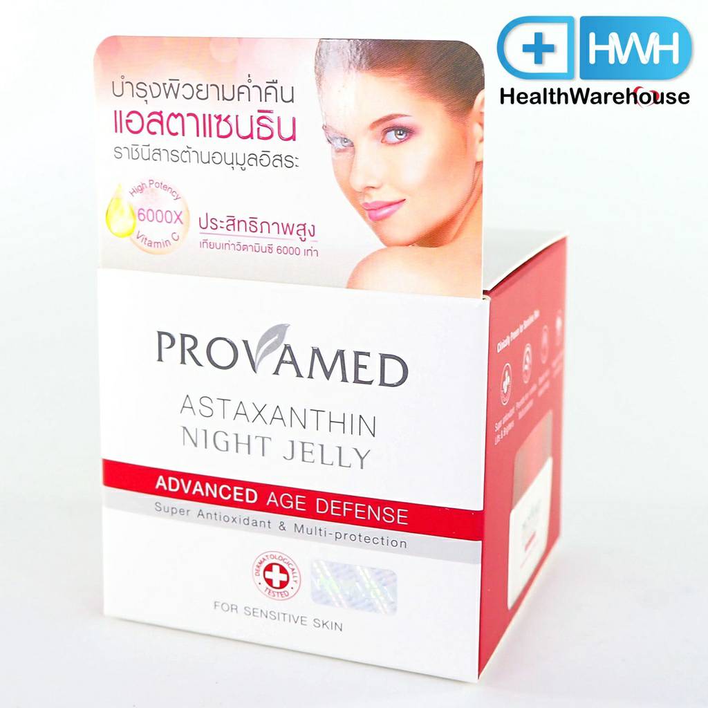 Provamed Astaxanthin Night Jelly นวัตกรรมเนื้อเจลลี่เข้มข้น คืนรูป เกลี่ยง่าย ไม่ทิ้งคราบ เปลี่ยนรูปเป็นเอสเซ้นส์ขณะลูบไล้ซึมซาบสู่ผิวอย่างล้ำลึก บำรุงผิวยามค่ำคืน ด้วยแอสตาแซนติน ราชินีสารต้านอนุมูลอิสระ มีประสิทธิภาพสูงเทียบเท่าวิตามินซี 6000 เท่า ช่วยลดเลือนความหมองคล้ำ ริ้วรอยแรกเริ่ม และความแห้งกร้าน ฟื้นฟูปรับสภาพผิวให้ยืดหยุ่น รู้สึกถึงผิวแน่นกระชับ เปล่งปลั่ง แลดูอ่อนเยาว์ สามารถใช้ได้แม้แต่กับผิวแพ้ง่าย